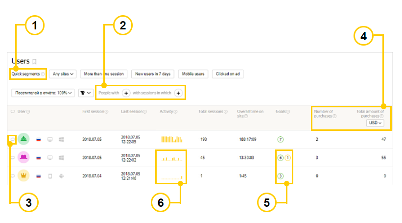 - 构成细分后,您可以筛选用户列表以仅显示符合所选条件的用户。 例如,这可能是通过 Yandex 搜索结果访问您网站的平板电脑用户。 有关更多信息,请参阅数据分段。
