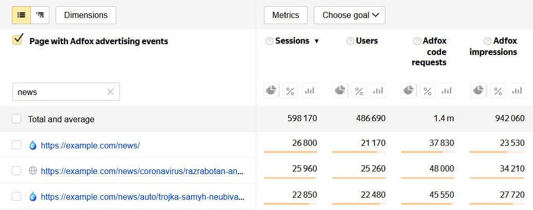 news,创建包含新闻的报表。 - 按降序排列 “Adfox 总收入”数据:带来最多收入的页面将显示在列表顶部。