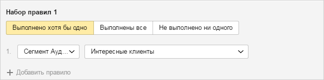 Задать условие показов в сетях для группы объявлений можно на странице ее создания или редактирования с помощью настройки ретаргетинга и подбора аудитории или профиля пользователей. Используйте сегменты Аудитории при создании набора правил: