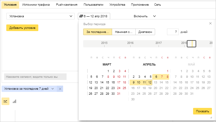 Например, вам нужно создать сегмент пользователей, которые установили игру за последнюю неделю. В AppMetrica перейдите к любому отчету и укажите категорию Условия. В выпадающем списке выберите событие и укажите период, за который оно должно произойти. Задайте название сегмента.