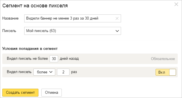 Например, если вы хотите отобрать пользователей, которые просмотрели ваш медиа-баннер не менее 3 раз за последние 30 дней, сформируйте такой сегмент: