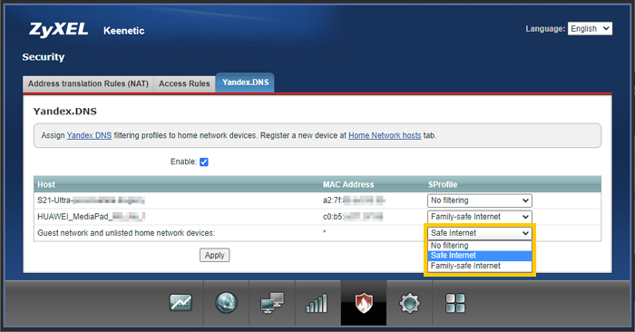 Yandex DNS is built into Zyxel routers. It can be configured for individual devices or for all devices at once.