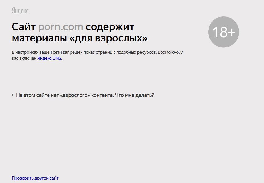 Если при попытке открыть сайт вы видите предупреждение о материалах «для взрослых», значит, на вашем устройстве активирован сервис Яндекс DNS.