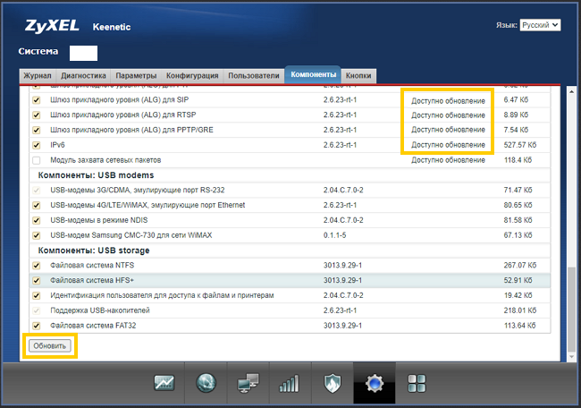 Если в списке активных компонентов указано Доступно обновление, внизу под списком нажмите Обновить.